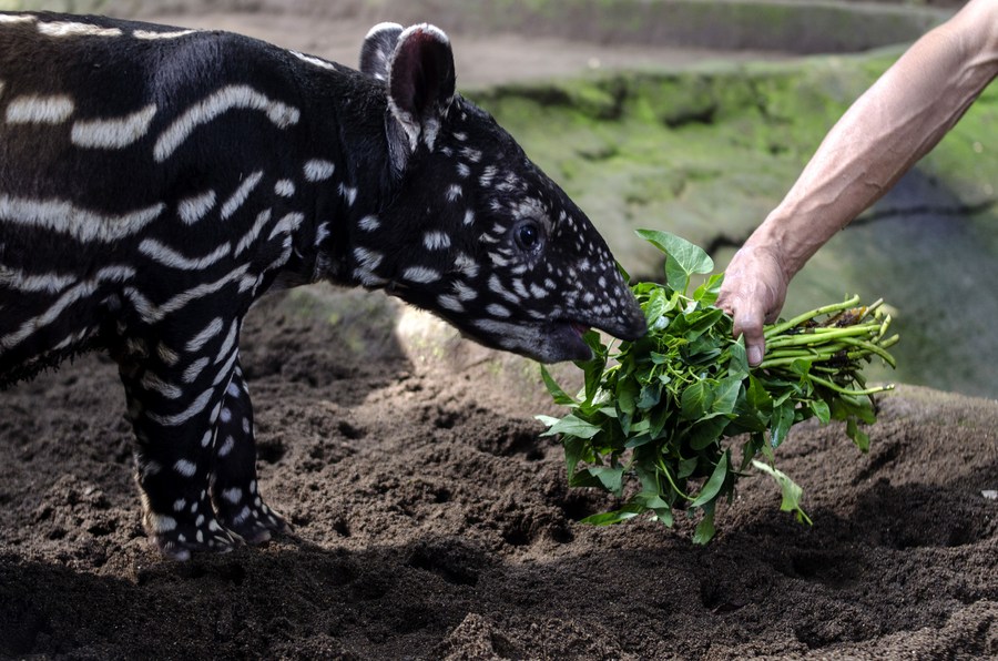 A zookeeper feeds a baby tapir at Bandung Zoological Garden in West Java, Indonesia, May 20, 2022. (Photo by Septianjar/Xinhua)