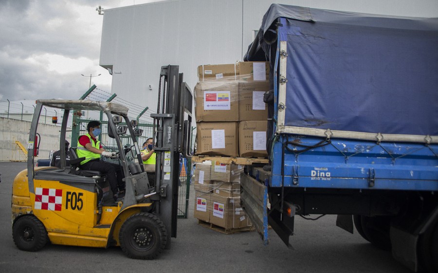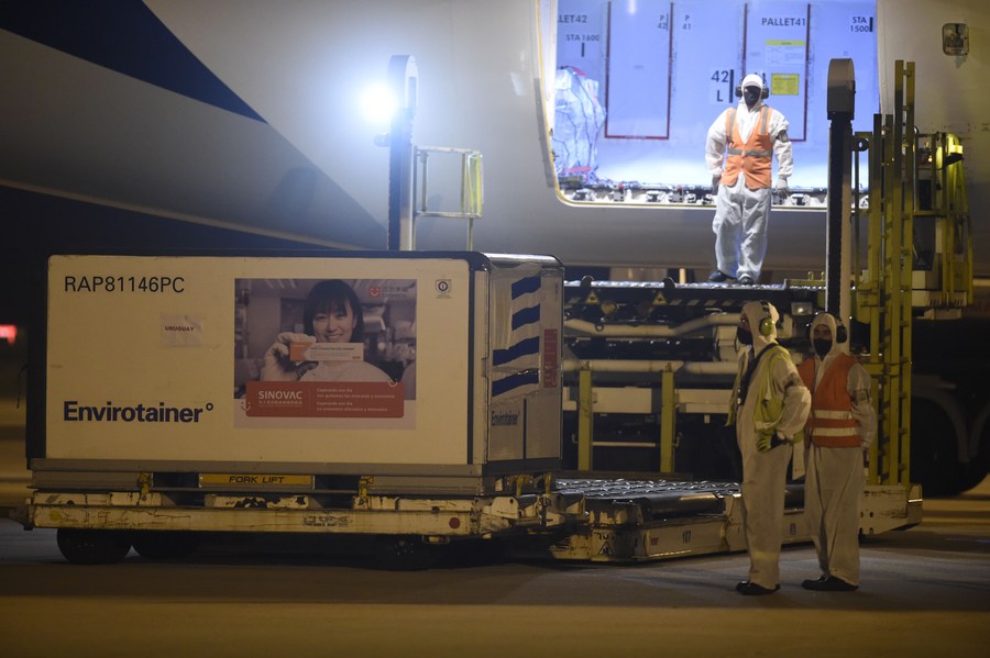 The first batch of COVID-19 vaccines made by Chinese pharmaceutical firm Sinovac is unloaded on its arrival in Montevideo, Uruguay, Feb. 25, 2021. (Photo by Nicolas Celaya/Xinhua)