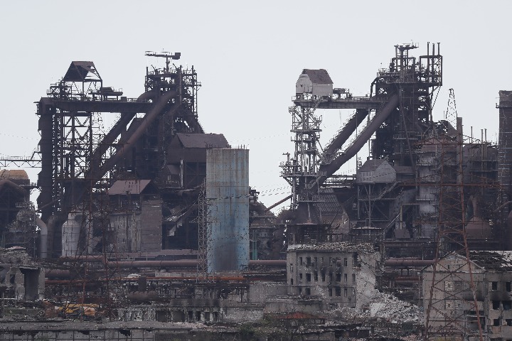 Photo taken on May 15, 2022 shows a view of the Azovstal plant in the port city of Mariupol. (Photo by Victor/Xinhua)