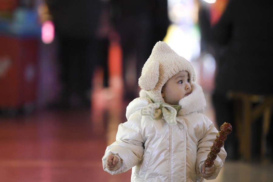 A child holds a stick of sugar-coated haw at the Grand Bazaar in Urumqi, capital of northwest China's Xinjiang Uygur Autonomous Region, at 11:46 p.m. Dec. 21, 2021. (Xinhua/Ma Kai)