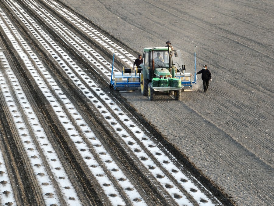A seeding machine with Beidou Navigation Satellite System works in a cotton field in Korla City, northwest China's Xinjiang Uygur Autonomous Region, April 3, 2022. (Photo by Huang Wanli/Xinhua)