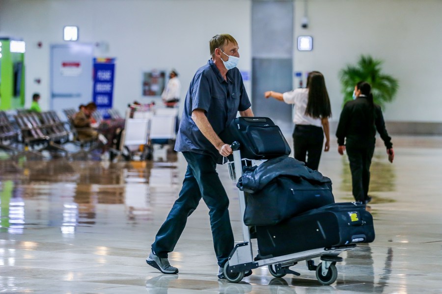A tourist is seen after arriving at the Ninoy Aquino International Airport (NAIA) Terminal 1 in Paranaque City, the Philippines, Feb. 11, 2022. (Xinhua/Rouelle Umali)