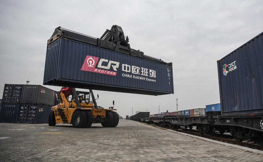 A loader lifts a container meant for the China-European freight train at the east railway station of the Qinzhou Port in Qinzhou City of south China's Guangxi Zhuang Autonomous Region, Jan. 16, 2021. (Xinhua/Zhang Ailin)■