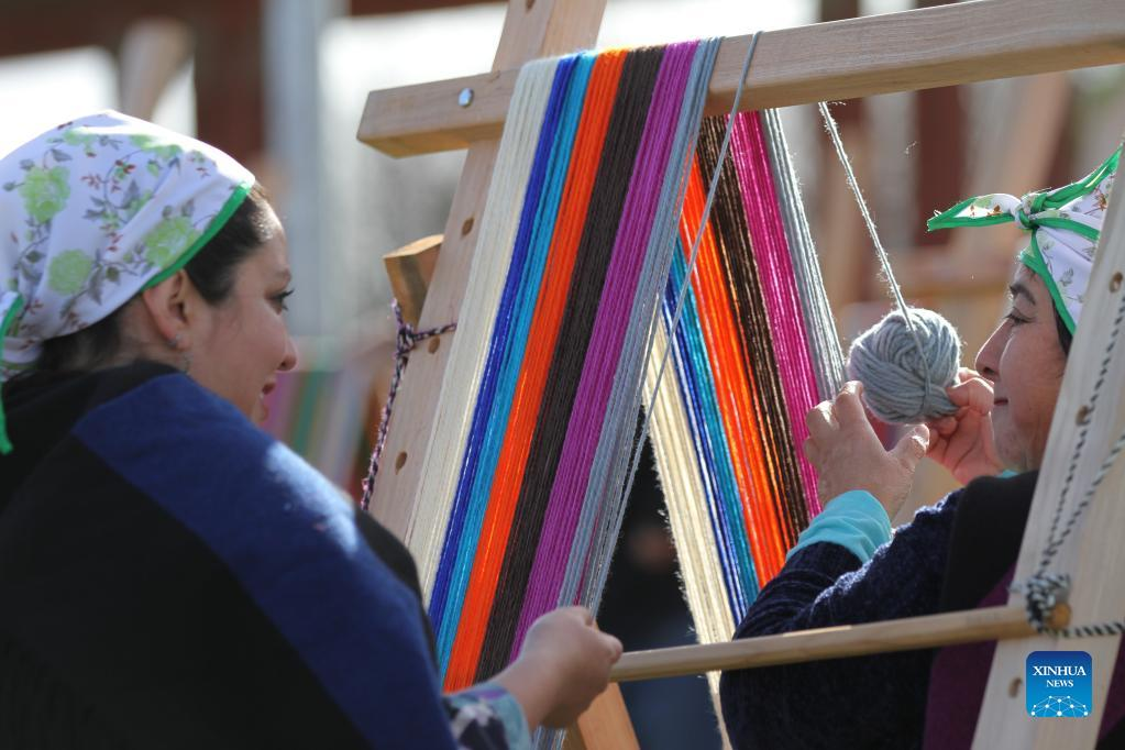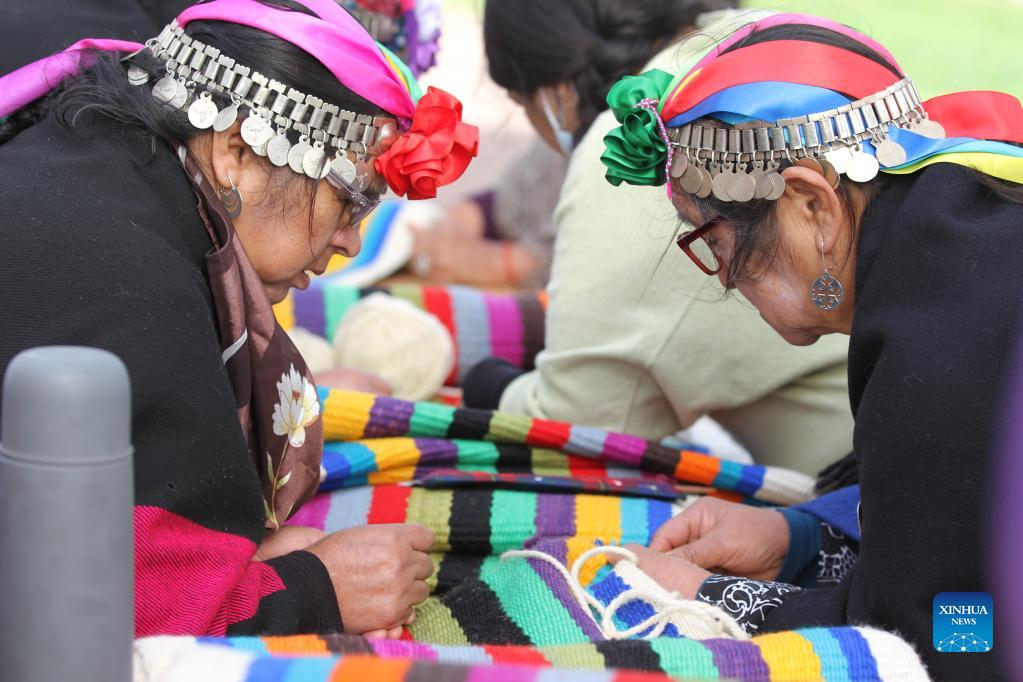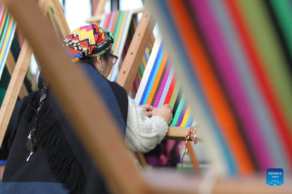 Mapuche women shows a loom weaving piece in Puerto Saavedra of Araucania, Chile, on May 21, 2022. A total of 426 indigenous Mapuche women from Chile and Argentina completed a loom weaving piece which measures about 900 meters in length, seeking to break a world record. (Xinhua)