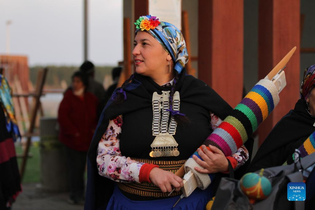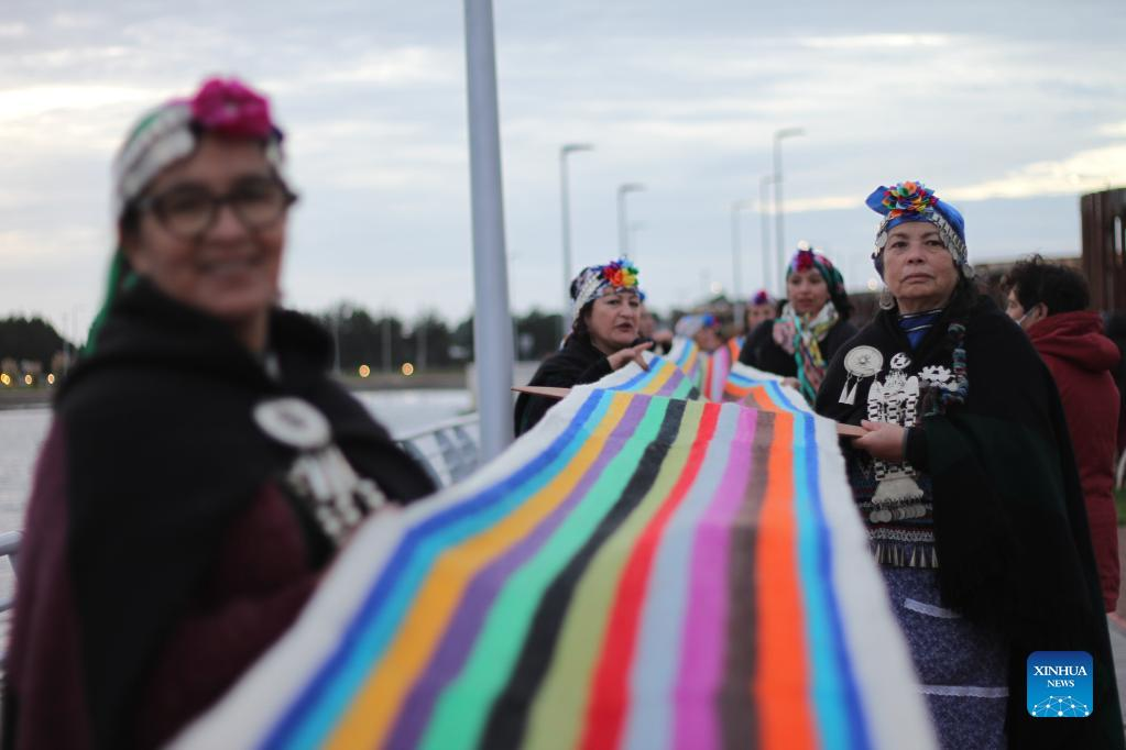 A Mapuche woman carries a loom weaving piece in Puerto Saavedra of Araucania, Chile, on May 21, 2022. A total of 426 indigenous Mapuche women from Chile and Argentina completed a loom weaving piece which measures about 900 meters in length, seeking to break a world record. (Xinhua)