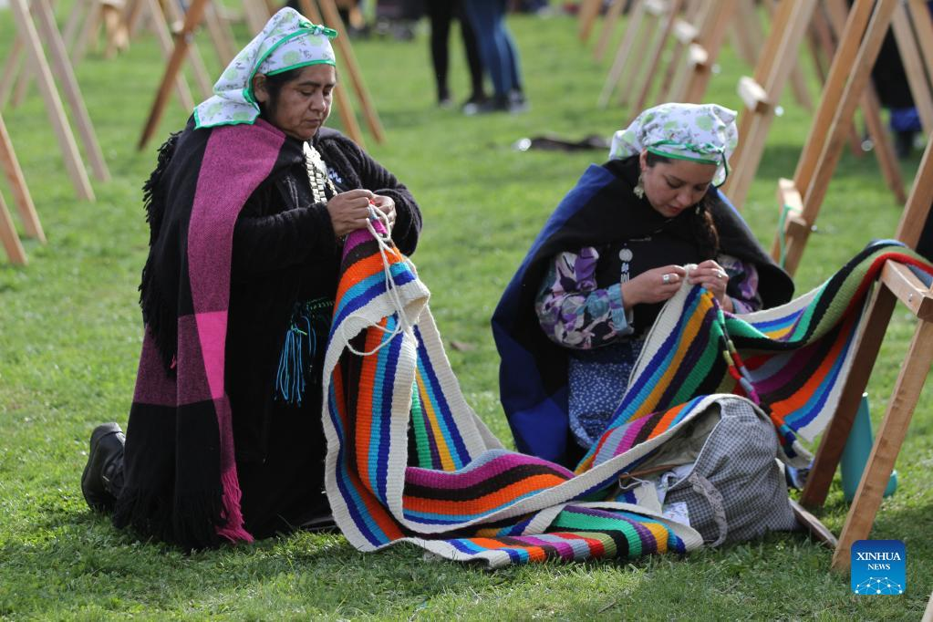 Mapuche women weave on a loom in Puerto Saavedra of Araucania, Chile, on May 21, 2022. A total of 426 indigenous Mapuche women from Chile and Argentina completed a loom weaving piece which measures about 900 meters in length, seeking to break a world record. (Xinhua)