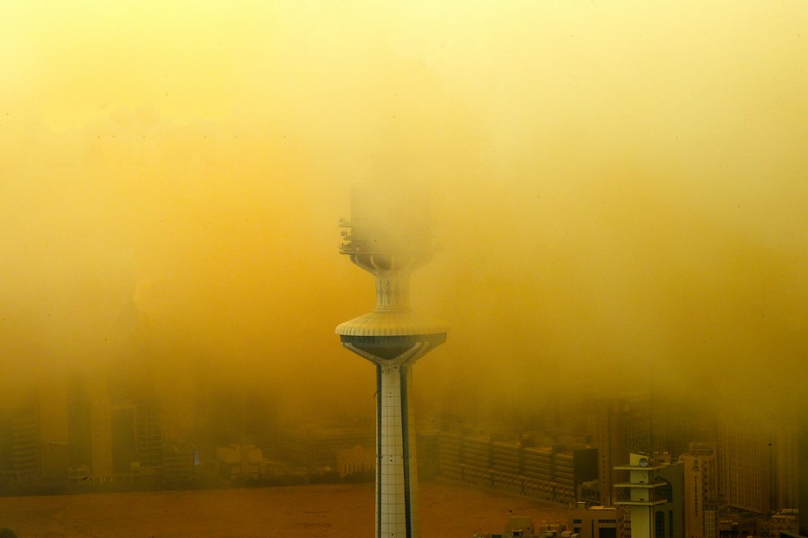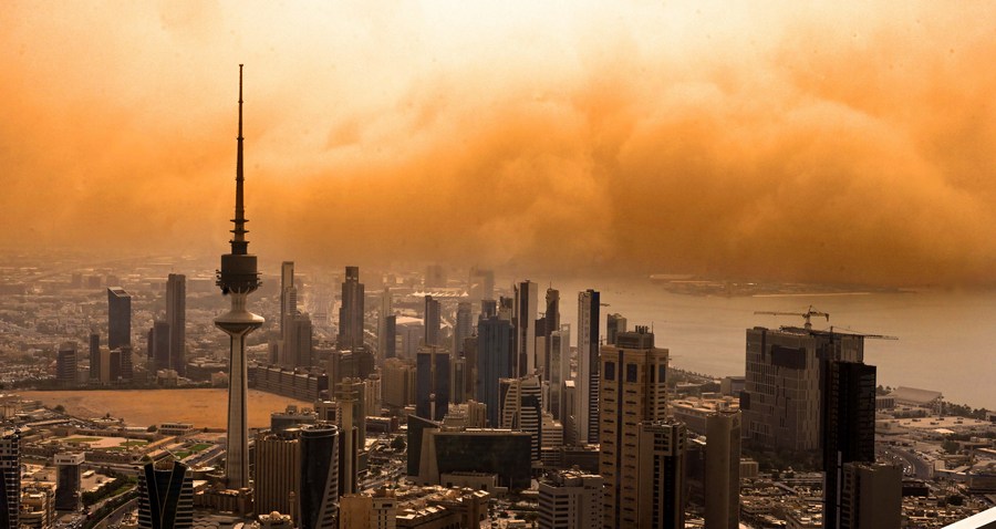 Photo taken on May 23, 2022 shows buildings shrouded in strong dust storm in Kuwait City, Kuwait. (Xinhua)