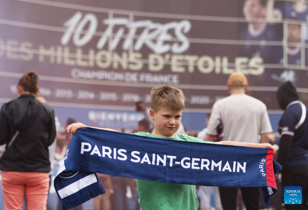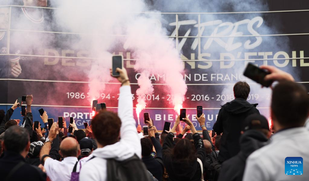 Fans celebrate outside the Parc des Princes stadium in Paris on May 23, 2022, two days after the club won the Ligue 1 title for a record-equalling tenth time and its superstar striker Mbappe chose to sign a new contract until 2025 at PSG rather than join Real Madrid. (Xinhua/Gao Jing)
