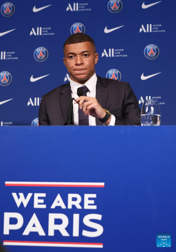Paris Saint-Germain's French forward Kylian Mbappe attends a press conference at the Parc des Princes stadium in Paris on May 23, 2022, two days after the club won the Ligue 1 title for a record-equalling tenth time and its superstar striker Mbappe chose to sign a new contract until 2025 at PSG rather than join Real Madrid. (Xinhua/Gao Jing)