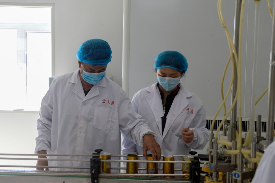 Staff workers are busy on the production line of a safflower oil company in Yumin County, northwest China's Xinjiang Uygur Autonomous Region, May 16, 2022. (Xinhua/Gao Han)