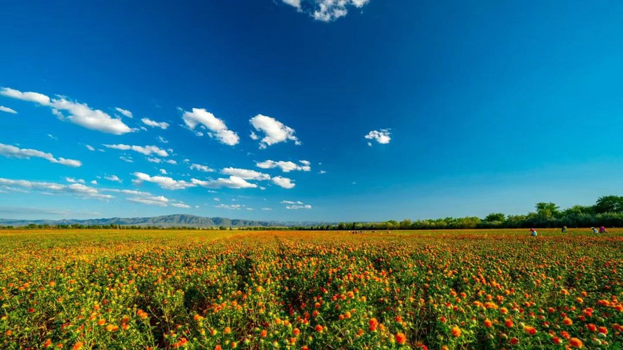 File photo taken in 2021 shows a safflower field in Yumin County, northwest China's Xinjiang Uygur Autonomous Region. (Xinhua)