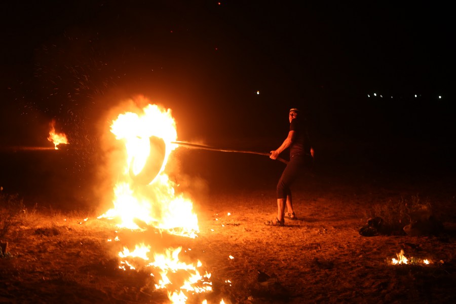 A protester burns a tire during clashes with Israeli soldiers on the Gaza-Israel border, east of the southern Gaza Strip city of Rafah, on Sept. 1, 2021. (Photo by Khaled Omar/Xinhua)