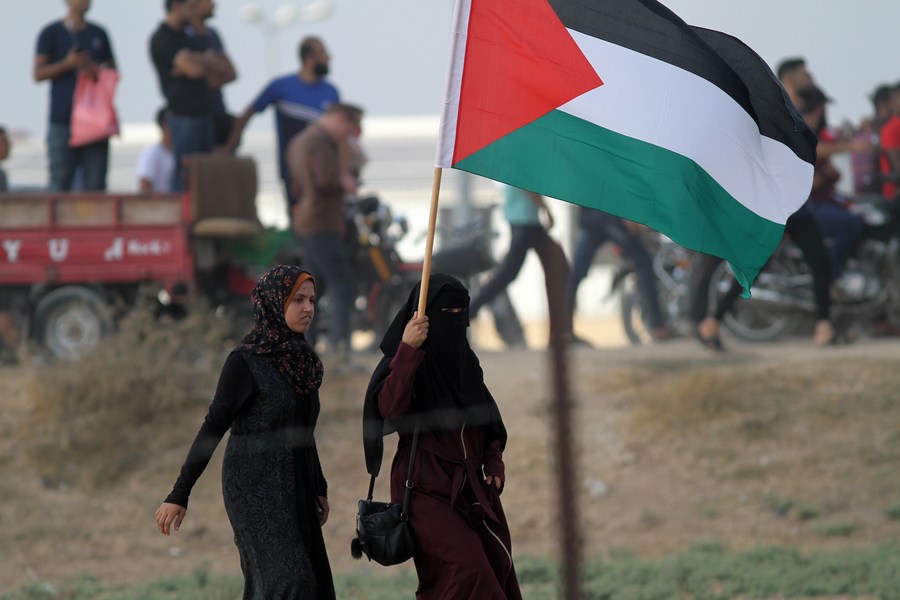 Palestinian women take part in a protest to mark 52nd anniversary of burning Al-Aqsa Mosque in East Jerusalem, on the Gaza-Israel border in east of southern Gaza Strip city of Khan Younis, Aug. 21, 2021. (Photo by Rizek Abdeljawad/Xinhua)