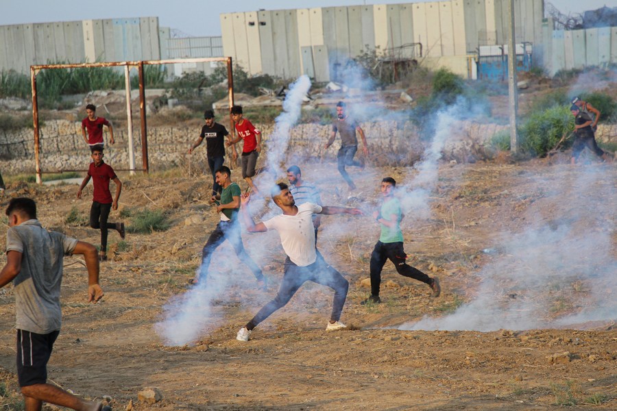 A Palestinian protester throws back a tear gas canister during a protest to mark 52nd anniversary of burning Al-Aqsa Mosque in East Jerusalem, on the Gaza-Israel border in east of southern Gaza Strip city of Khan Younis, Aug. 21, 2021. (Photo by Rizek Abdeljawad/Xinhua)