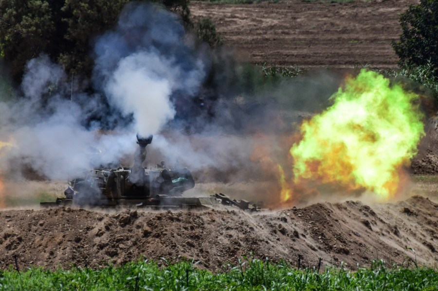 Israeli army artillery corps fire towards Gaza near the Israel-Gaza border near southern Israeli city of Sderot on May 16, 2021. (Tomer Neuberg/JINI via Xinhua)