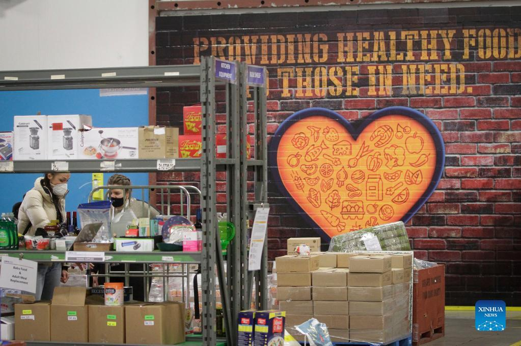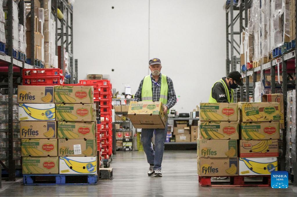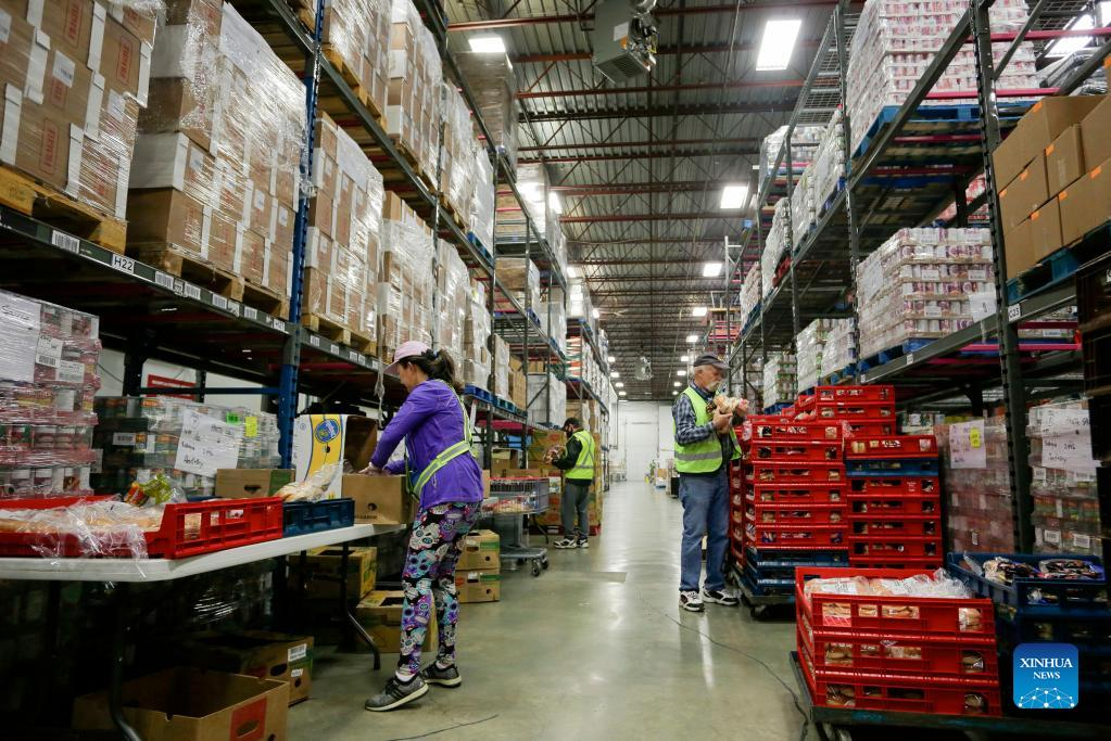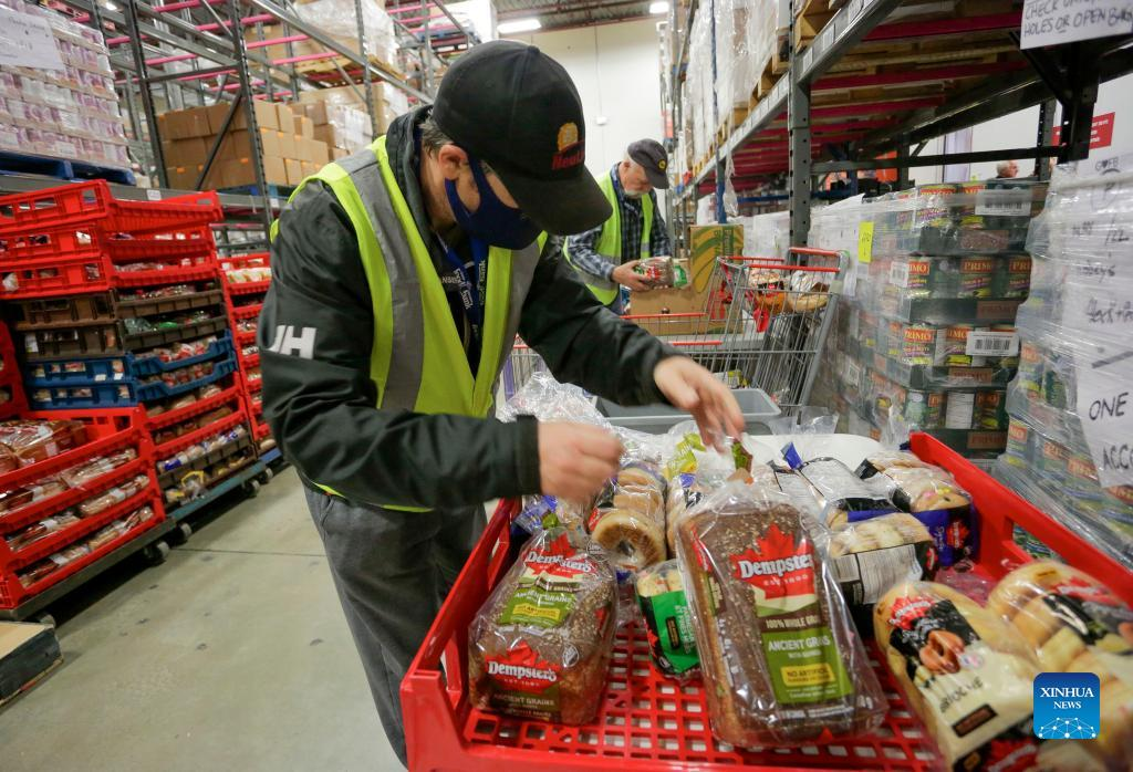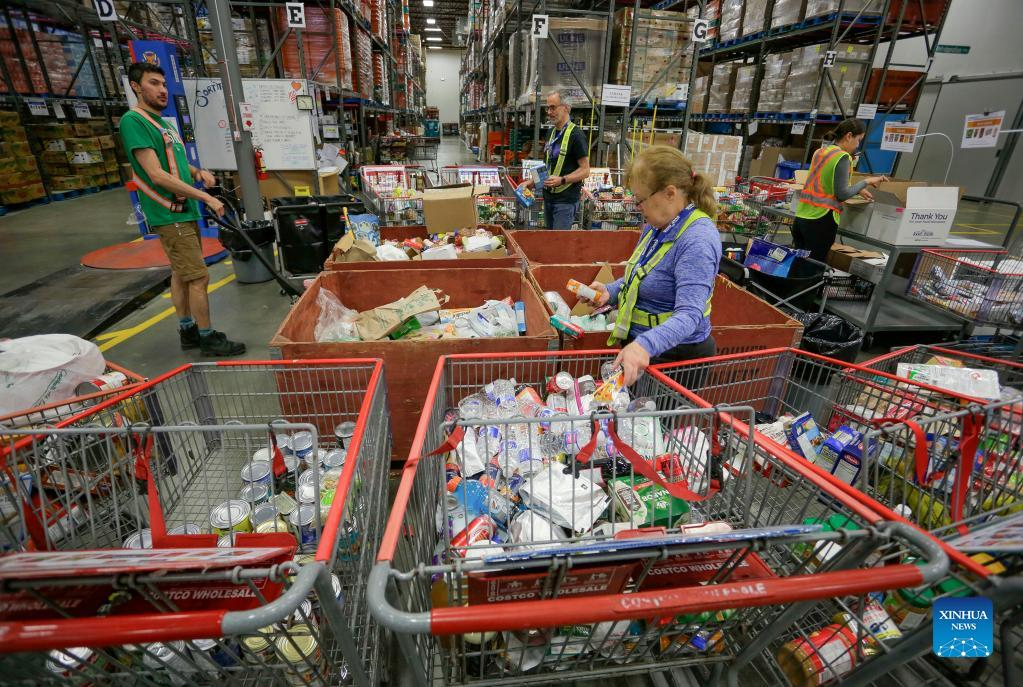 Volunteers work inside the Greater Vancouver Food Bank's facility in Burnaby, British Columbia, Canada, on May 25, 2022. Due to the COVID-19 pandemic and high inflation, there are more people demanding food from the food banks, according to a spokesperson from Greater Vancouver Food Bank. (Photo by Liang Sen/Xinhua)