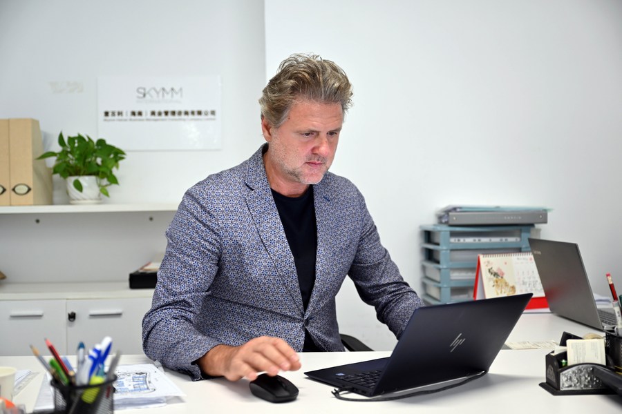 Stefano Fedi works at his office in Haikou, south China's Hainan Province, April 25, 2022. (Xinhua/Guo Cheng)