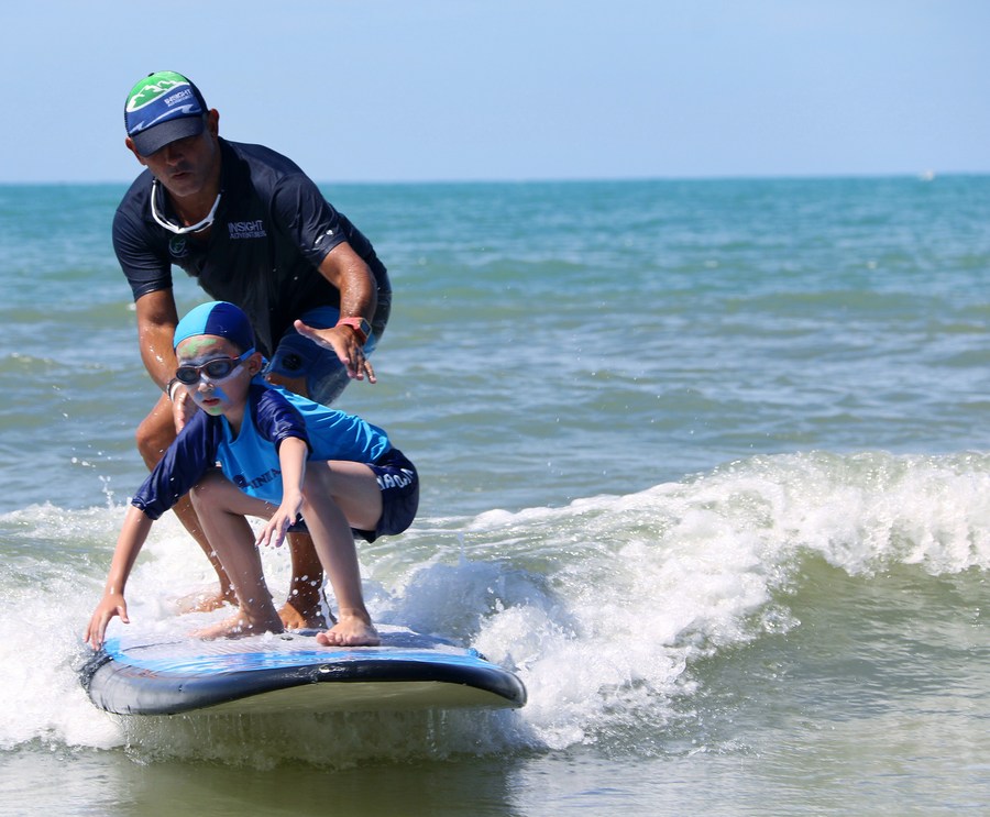 Nicola Zanella coaches a kid to surf in Sanya, south China's Hainan Province, July 22, 2016. (Xinhua)