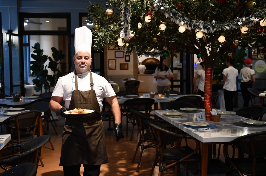 Daniele Vacca serves a dish at his restaurant in Sanya, south China's Hainan Province, Dec. 28, 2021. (Xinhua/Guo Cheng)
