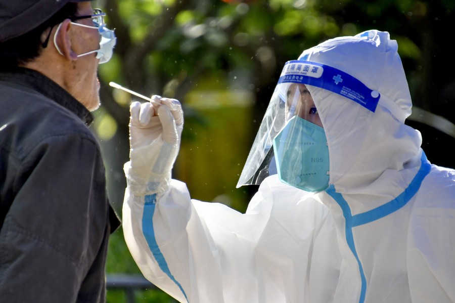 A medical worker takes a swab sample from a citizen for nucleic acid testing in Chaoyang District of Beijing, capital of China, May 13, 2022.(Xinhua/Li Xin)