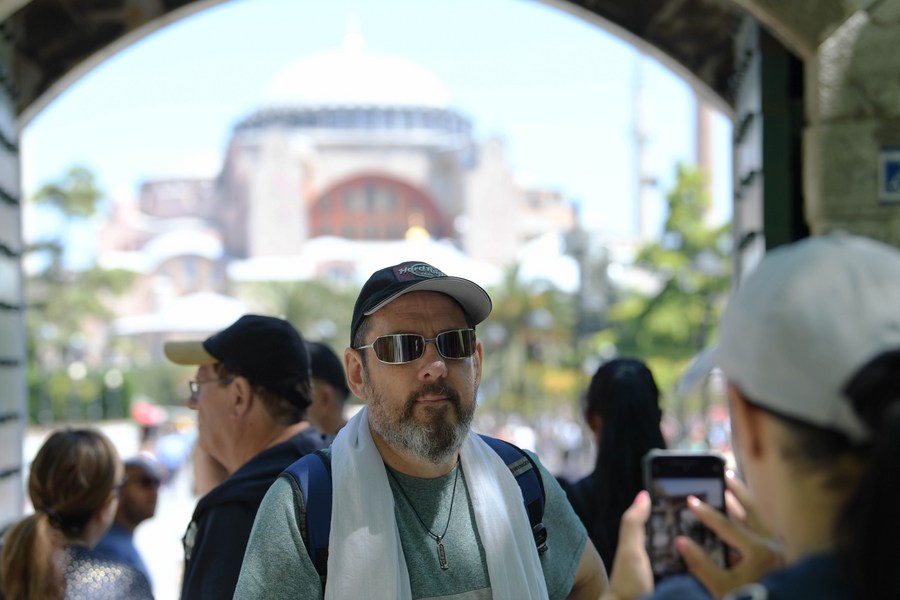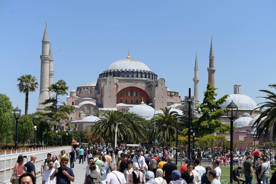 Tourists are seen near Hagia Sophia in Istanbul, Turkey, May 24, 2022. (Xinhua/Shadati)