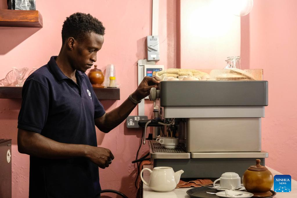 Roy Rusa, the manager and barista, makes coffee at Silent Cafe, an eatery owned and run by deaf people, in Nankulabye, a suburb of Kampala, Uganda, on May 24, 2022. (Photo by Hajarah Nalwadda/Xinhua)