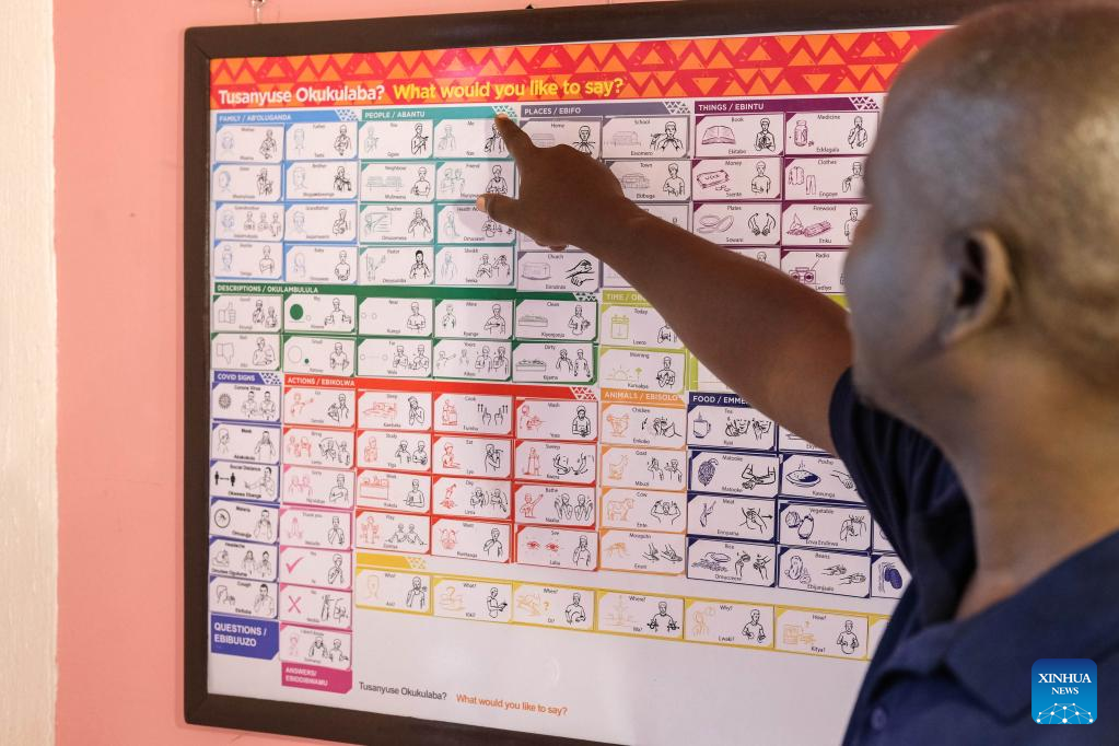 The proprietor Nasser Ssenyondo shows a sign language board at Silent Cafe, an eatery owned and run by deaf people, in Nankulabye, a suburb of Kampala, Uganda, on May 24, 2022. (Photo by Hajarah Nalwadda/Xinhua)