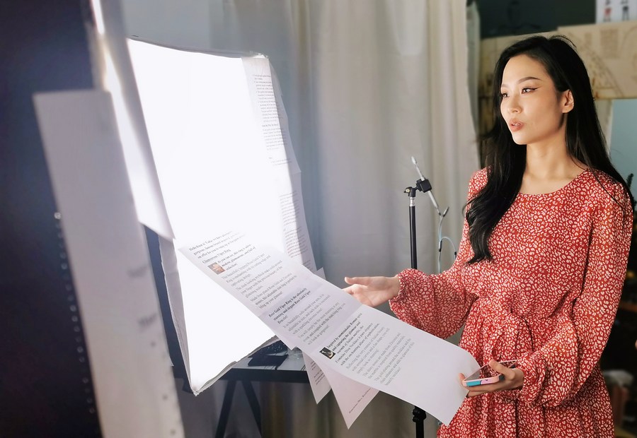 Dora He prepares for live-streaming in Guangzhou, south China's Guangdong Province, Feb. 28, 2022. (Xinhua/Ding Le)