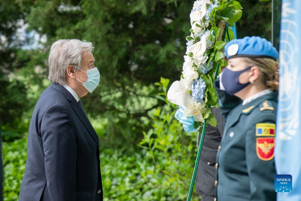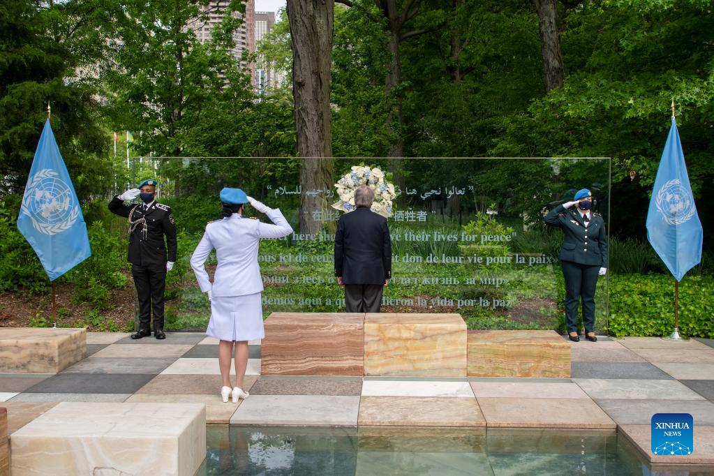 UN Secretary-General Antonio Guterres (L) lays a wreath at the UN Headquarters in New York, on May 26, 2022, to pay homage to fallen UN peacekeepers. The events formed the annual observance of the International Day of UN Peacekeepers, which falls on May 29. (Mark Garten/UN Photo/Handout via Xinhua)