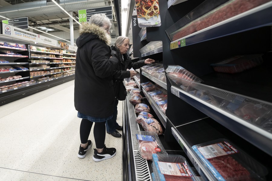 People shop in a supermarket in Manchester, Britain, on April 13, 2022. (Photo by Jon Super/Xinhua)