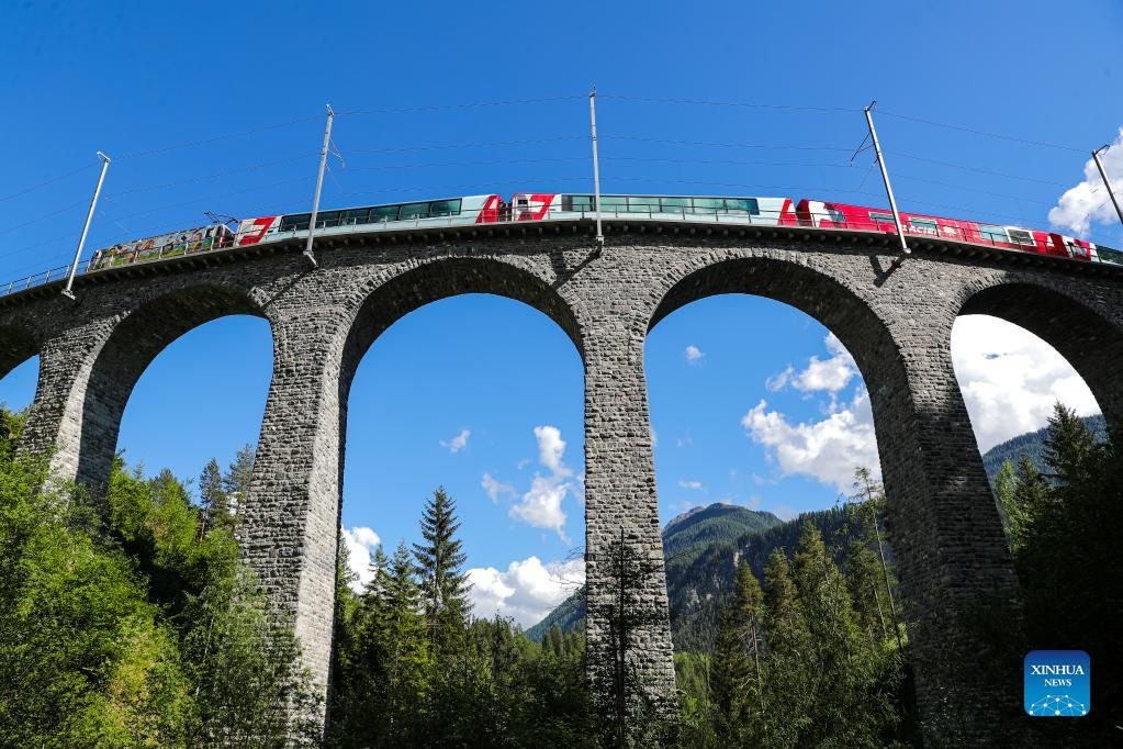 A train runs on the Rhaetian Railway in the Albula/Bernina landscapes in Switzerland, May 26, 2022. The Rhaetian Railway in the Albula/Bernina landscapes was included in the UNESCO World Heritage List in 2008. (Xinhua/Zheng Huansong)