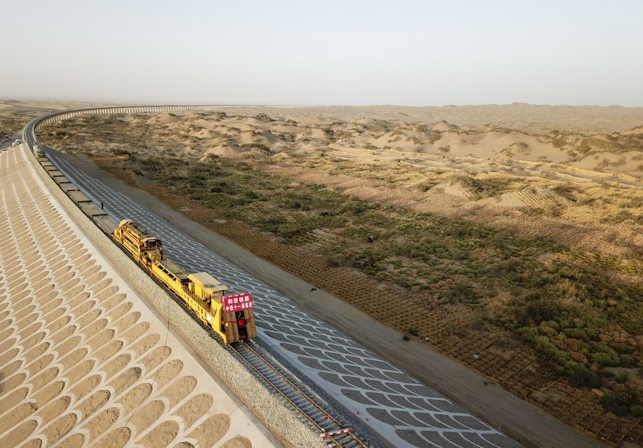 The railway, which is expected to be operational next month, will complete the final section of the Taklimakan Desert railway loop line and promote the economic and social development of southern Xinjiang. ■