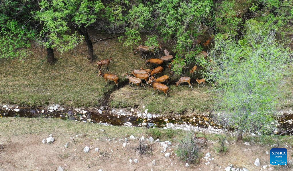 Aerial photo taken on May 23, 2022 shows Milu deers foraging along the river at the Daqingshan Nature Reserve in north China's Inner Mongolia Autonomous Region.