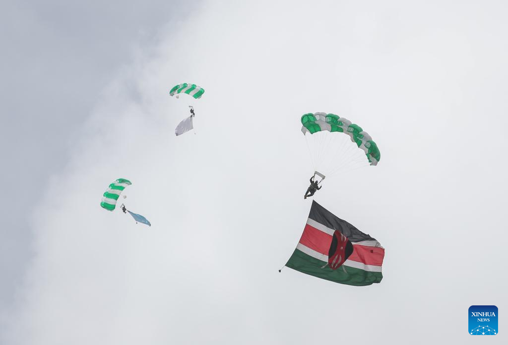 Photo taken on May 28, 2022 shows a parachute display during the Museum Air Show Festival in Nairobi, Kenya. (Xinhua/Long Lei)