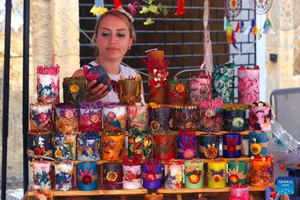 A woman looks at a candle at Gemmayze Street fair in Beirut, Lebanon, on May 29, 2022. Thousands of Lebanese and foreign visitors flocked to Beirut's famous Gemmayze Street on Sunday to attend a fair aimed at bringing back life to the city's beating heart that has been mired in a steep financial crisis for years.(Xinhua/Bilal Jawich)