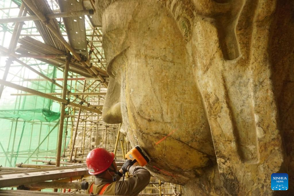 Undated file photo shows an archaeologist examining the face of a Buddha statue at the Fengxiansi Cave of Longmen Grottoes in central China's Henan Province. (Longmen Grottoes Research Institute/Handout via Xinhua)