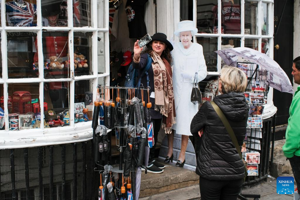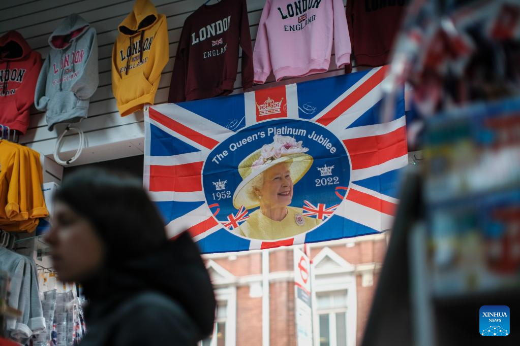 Photo taken on May 30, 2022 shows merchandise on sale near Piccadilly Circus in preparation for the Platinum Jubilee celebrations for Britain's Queen Elizabeth II in London, Britain. (Photo by Tim Ireland/Xinhua)