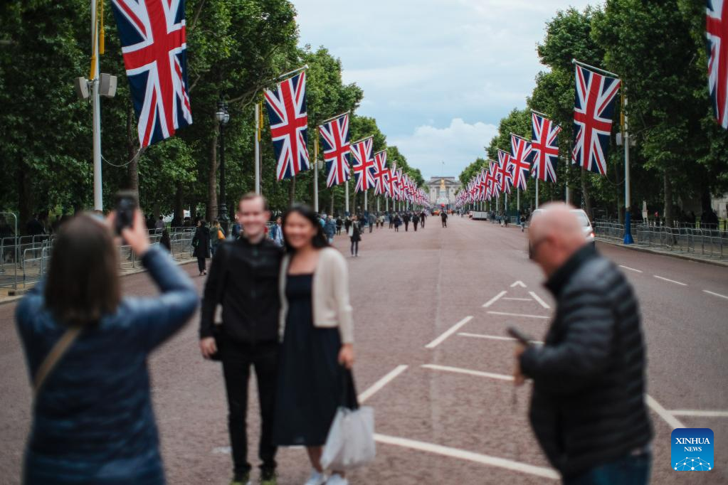 Photo taken on May 30, 2022 shows flags flying at the Mall in front of Buckingham Palace in preparation for the Platinum Jubilee celebrations for Britain's Queen Elizabeth II in London, Britain. (Photo by Tim Ireland/Xinhua)