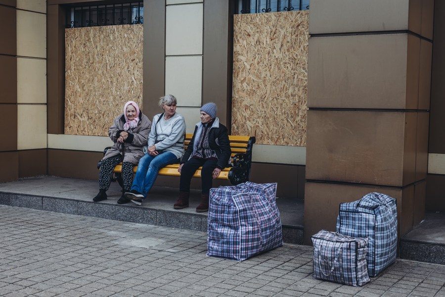 People sit on a bench in Donetsk, May 23, 2022. (Photo by Diego Herrera/Xinhua)