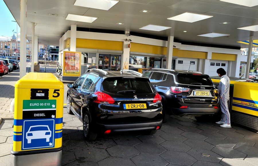 A man fuels a vehicle at a gas station in The Hague, the Netherlands, on April 2, 2022. (Xinhua/Wang Xiangjiang)