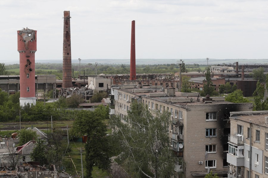 Photo taken on May 26, 2022 shows a view of damaged constructions in Popasna of Luhansk. (Photo by Victor/Xinhua)