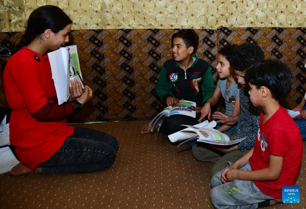Hiba Moussa (1st L) teaches her siblings at their home in Jaramana, a city three kilometers southeast of Damascus, Syria, on May 25, 2022. (Photo by Ammar Safarjalani/Xinhua)