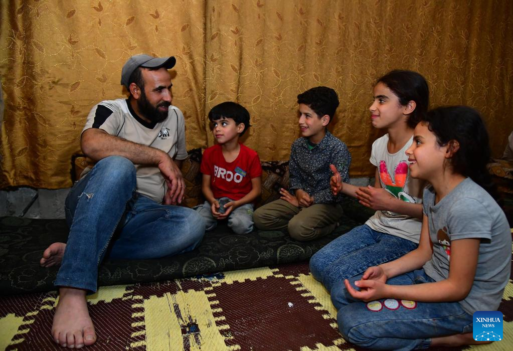 Muhammad Moussa (1st L), talks with his children at their home in Jaramana, a city three kilometers southeast of Damascus, Syria, on May 25, 2022. (Photo by Ammar Safarjalani/Xinhua)
