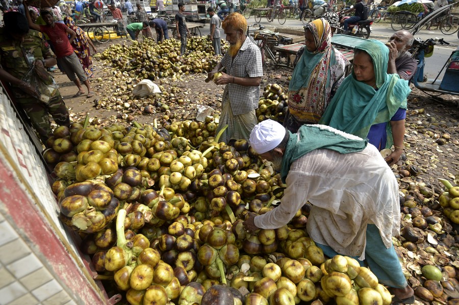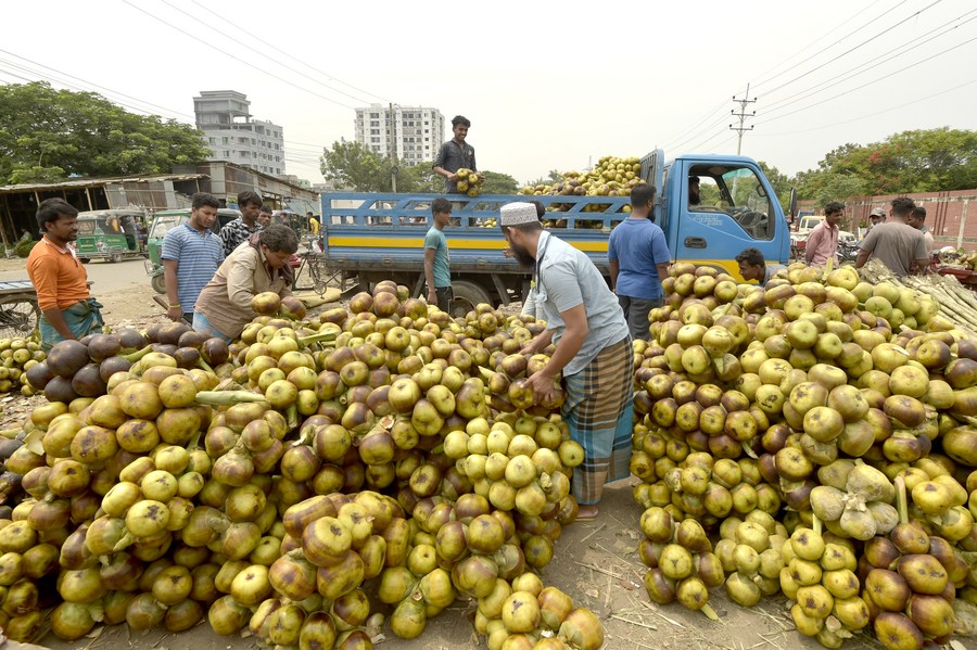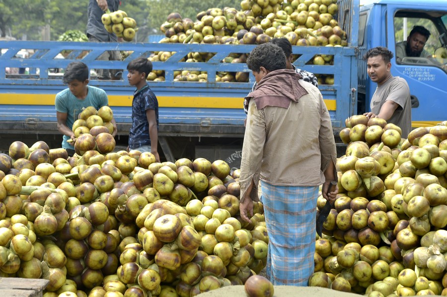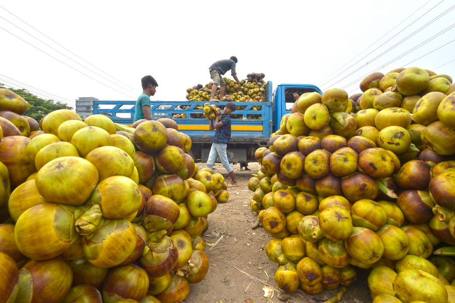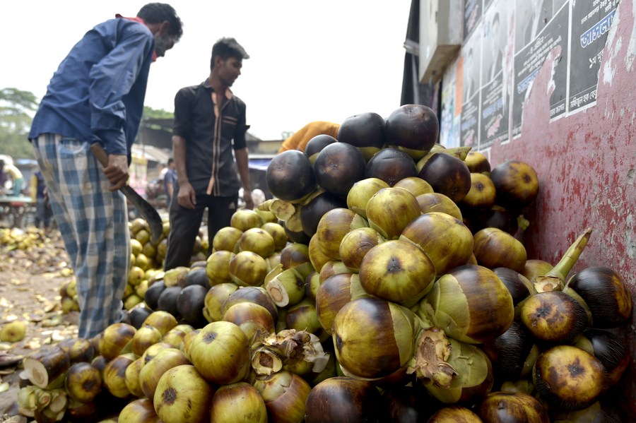 Laborers process palmyra palm fruits at a wholesale market in Dhaka, Bangladesh, May 29, 2022. (Xinhua)