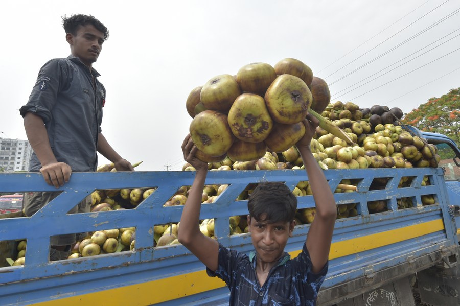 Laborers unload bunches of palmyra palm fruits from a truck at a wholesale market in Dhaka, Bangladesh, May 29, 2022. (Xinhua)