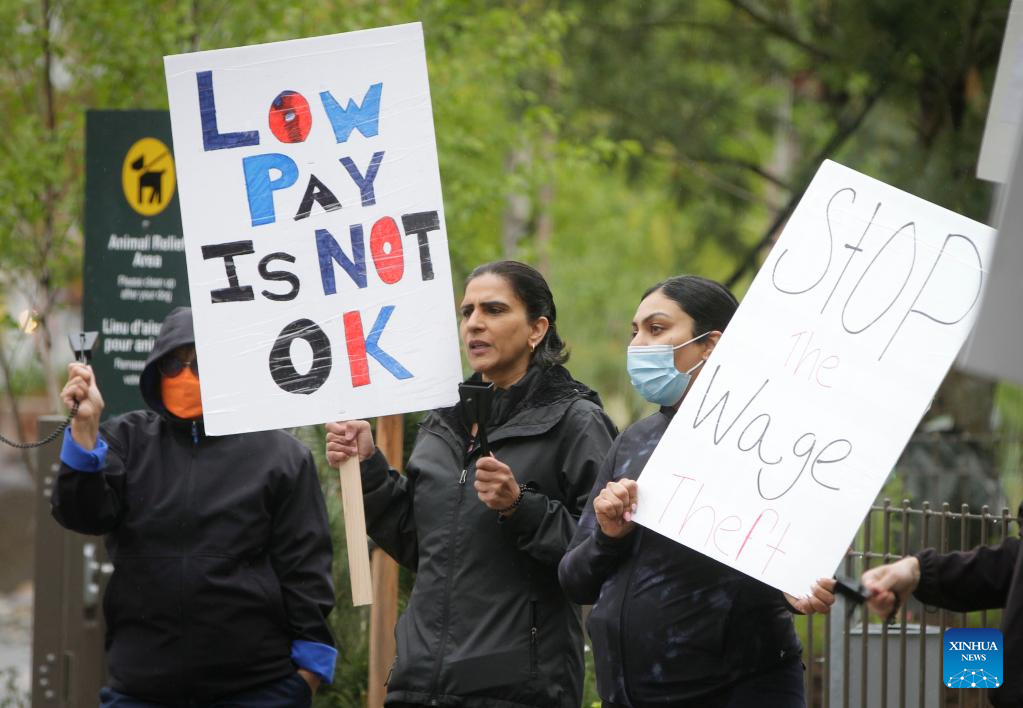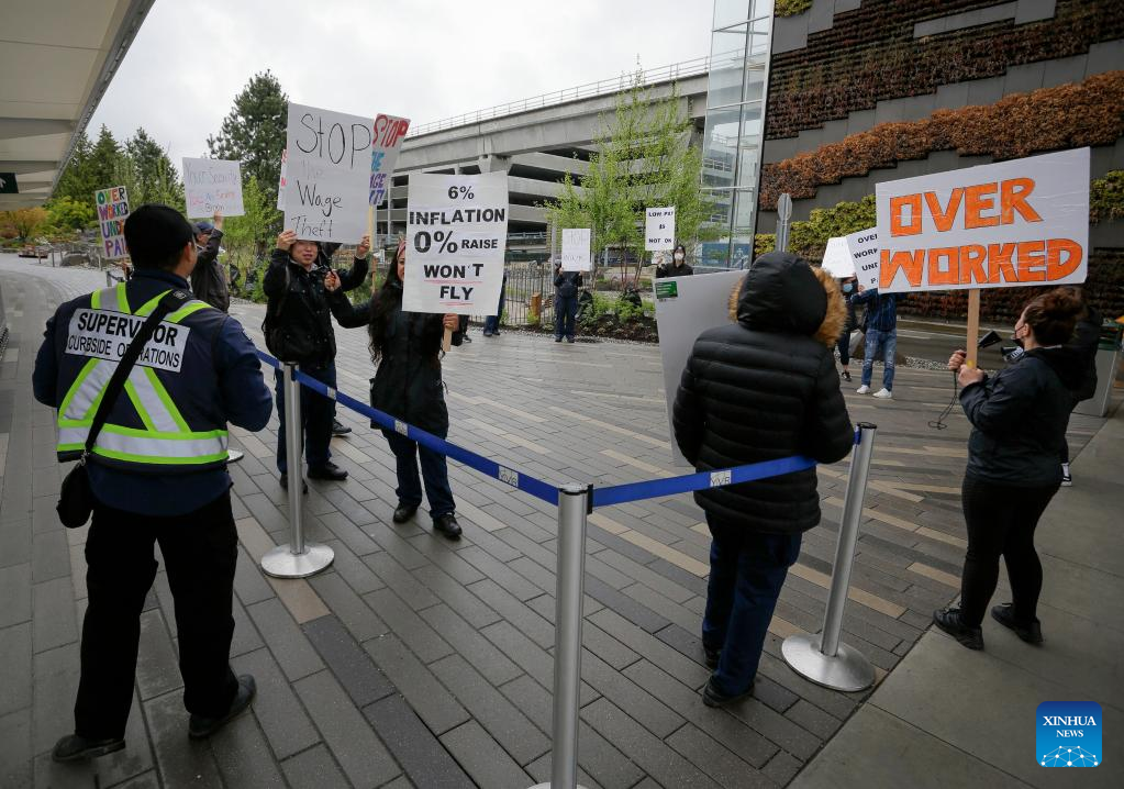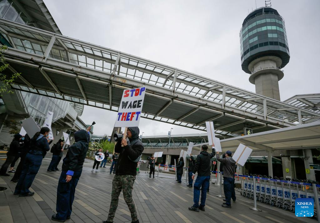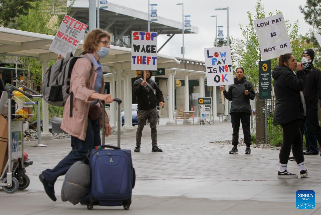 People hold placards during a rally at Vancouver International Airport in Richmond, British Columbia, Canada, on May 30, 2022. Security screening officers at Vancouver International Airport rallied Monday for better pay and less strenuous working conditions. (Photo by Liang Sen/Xinhua)