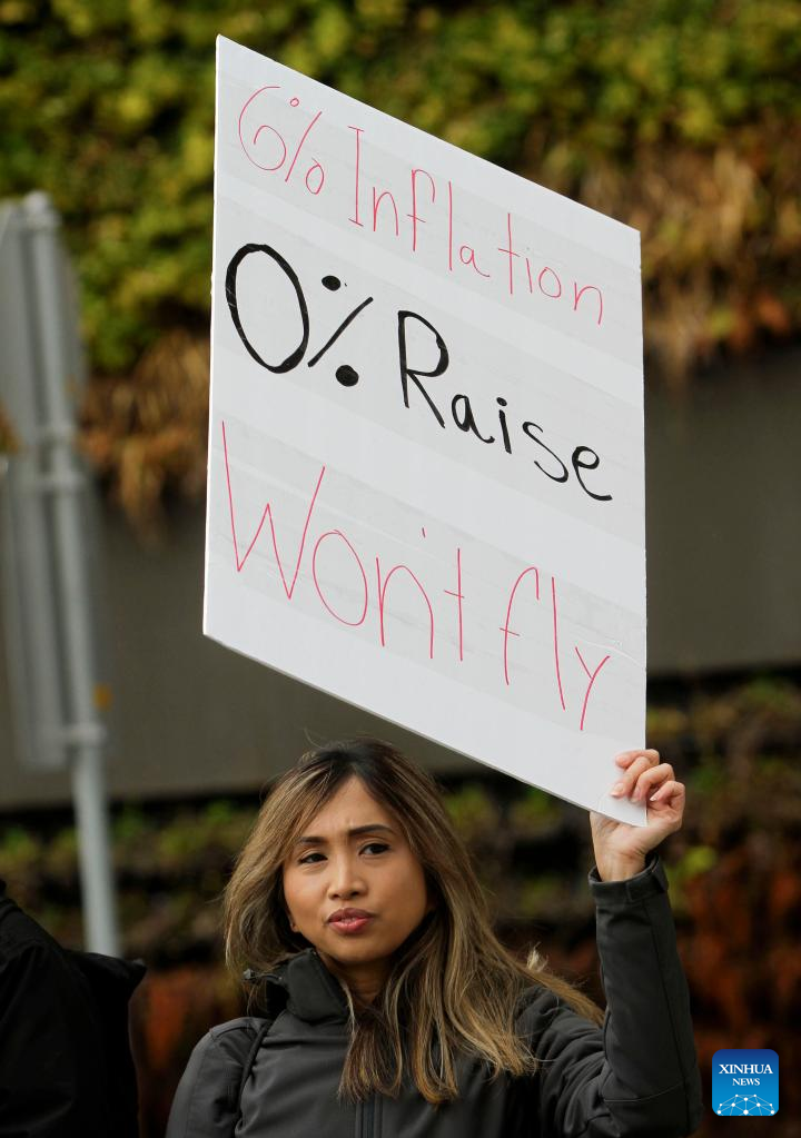 A woman holds a placard during a rally at Vancouver International Airport in Richmond, British Columbia, Canada, on May 30, 2022. Security screening officers at Vancouver International Airport rallied Monday for better pay and less strenuous working conditions. (Photo by Liang Sen/Xinhua)