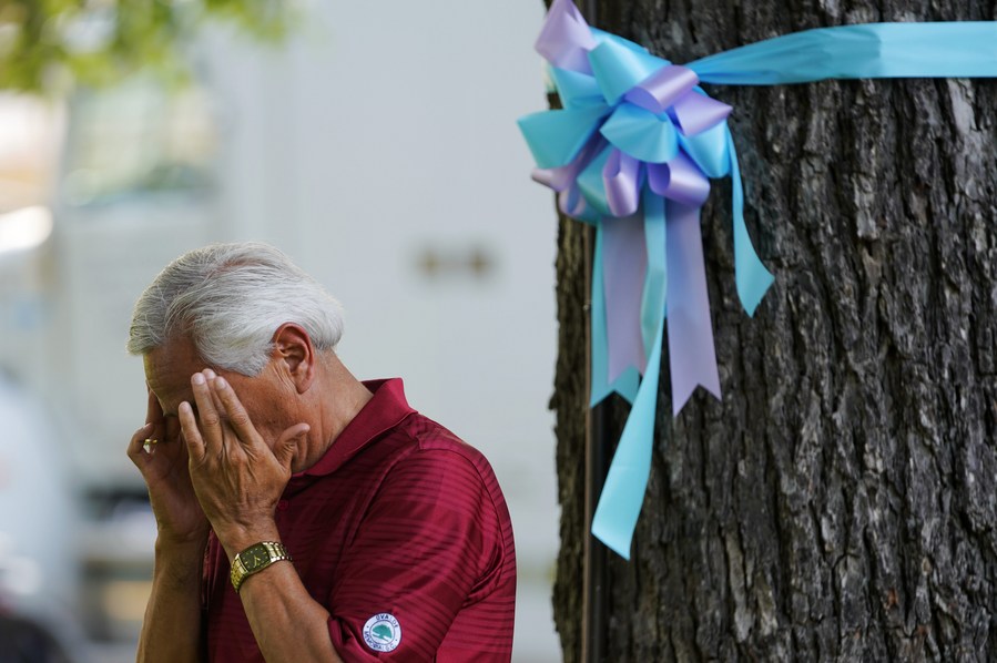 A man mourns for victims of a school mass shooting at Town Square in Uvalde, Texas, the United States, May 28, 2022. (Xinhua/Wu Xiaoling)
