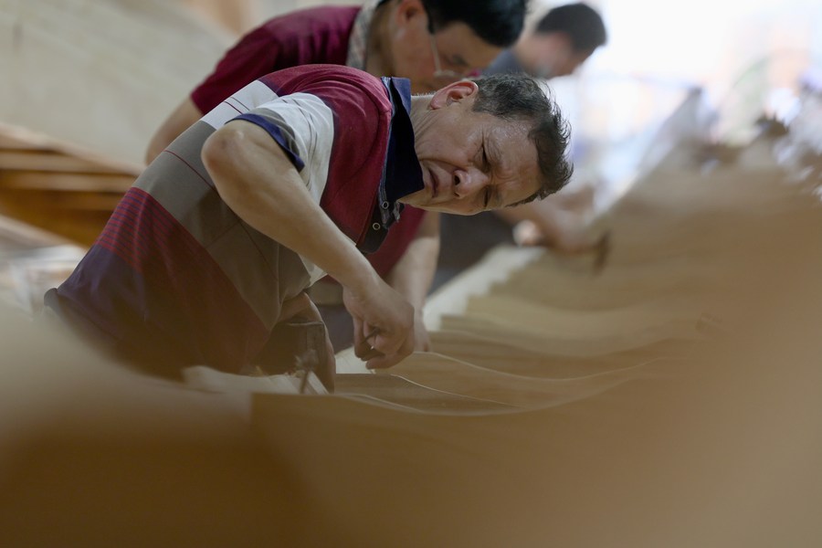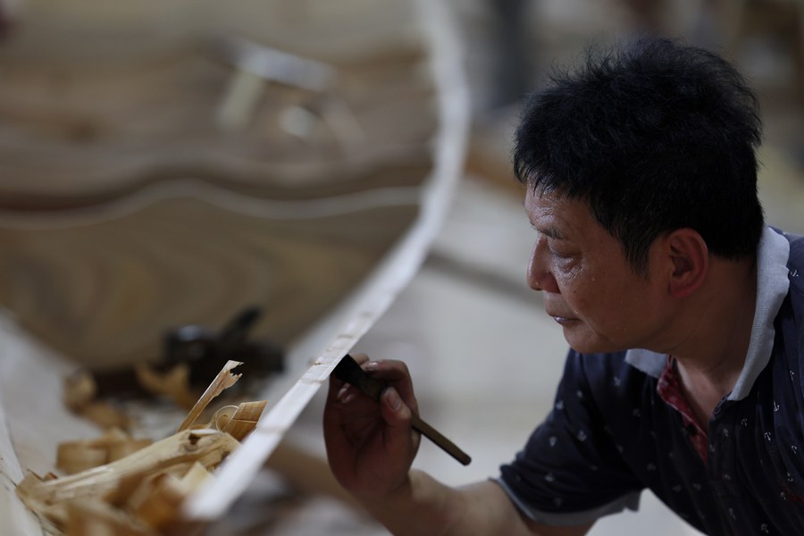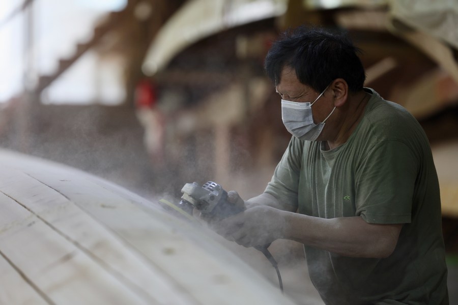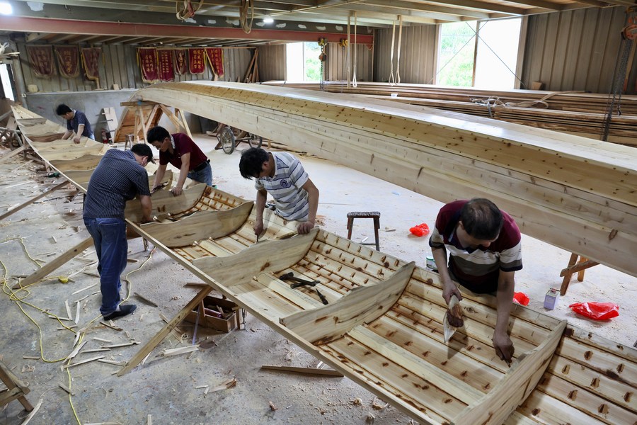 A craftsman builds a dragon boat at Fangzhongxiong dragon boat factory in Fangzhuang Village of Nantong Township in Minhou County of Fuzhou, southeast China's Fujian Province, May 30, 2022. (Xinhua/Jiang Kehong)
