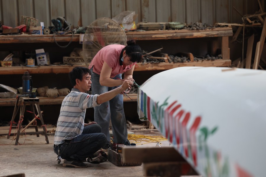 Painter Pan Shujian and his wife paint traditional patterns on a newly made dragon boat at Fanghegang dragon boat factory in Fangzhuang Village of Nantong Township in Minhou County of Fuzhou, southeast China's Fujian Province, May 30, 2022. (Xinhua/Jiang Kehong)